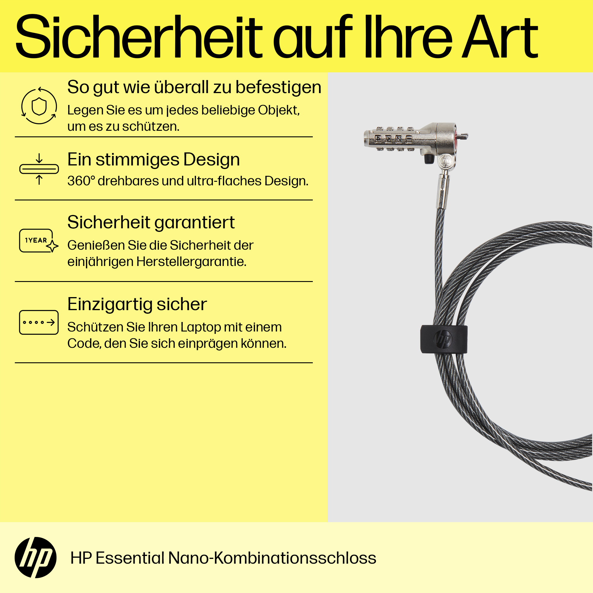 Sorgen Sie mit dem HP Essential Nano-Kombinationsschloss, das für alle HP Notebooks mit Nano-Lock-Steckplatz[1] geeignet ist, für ein abgeschlossenes und sicheres Laptop. Wählen Sie eine Kombination, die nur Sie kennen und verriegeln Sie das Kabelschloss für schlüssellose, sorgenfreie Sicherheit an fast jedem Ort.