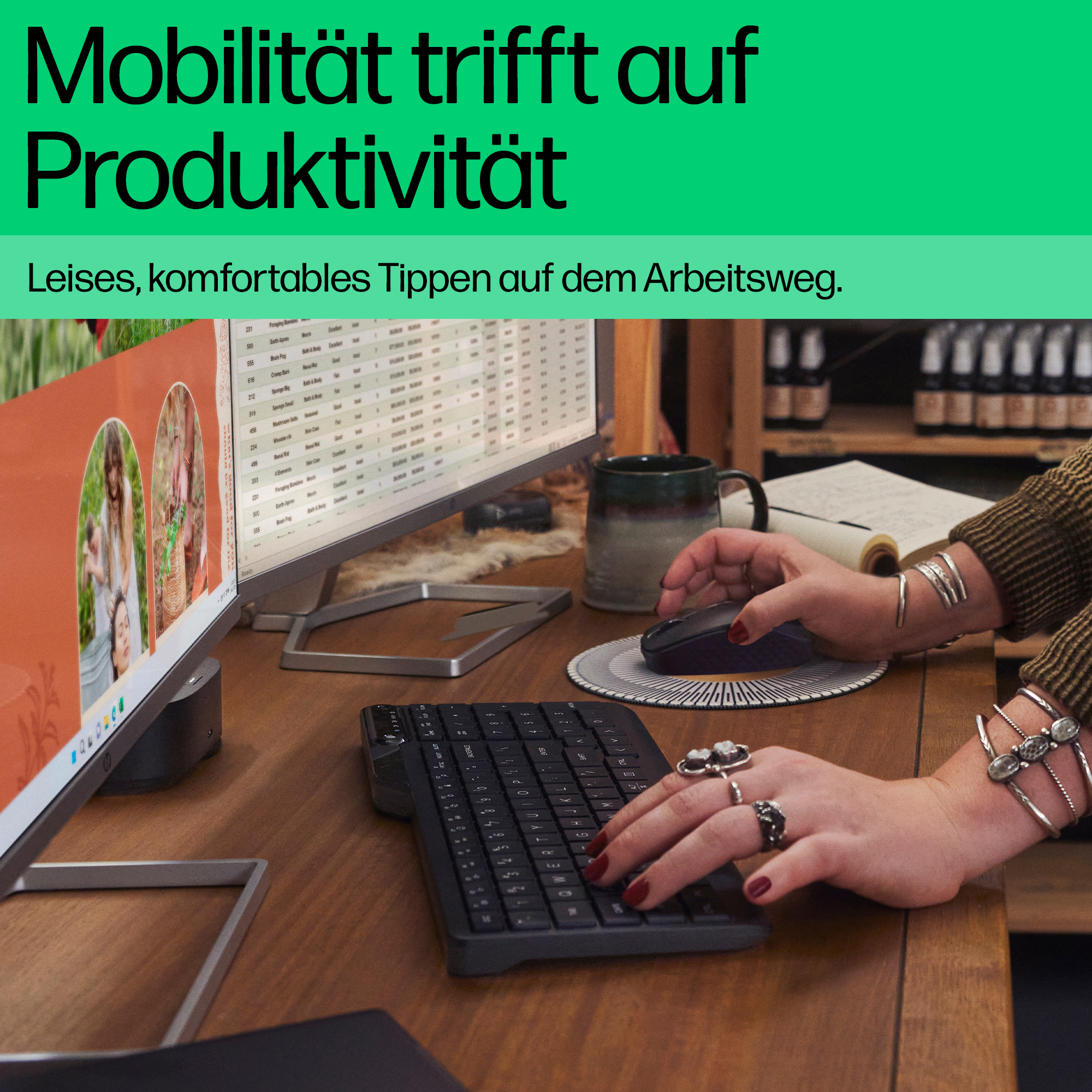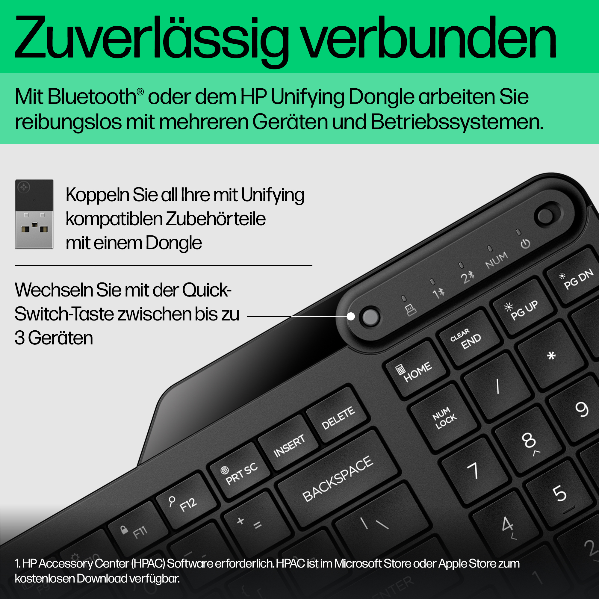 Voll einsatzbereit überall, wo Sie es sindMit der HP 475 Dual-Mode Wireless-Tastatur sind Sie jeder Aufgabe gewachsen. Sie bietet volle Bürofunktionalität und lässt sich gleichzeitig problemlos überall hin mitnehmen. Diese Tastatur für mehrere Geräte ist funktional und gleichzeitig mobil, vielseitig einsetzbar, verfügt über erhöhte Sicherheitsfunktionen und ist darauf ausgelegt, dass Sie mobil arbeiten und stets in Verbindung bleiben können.