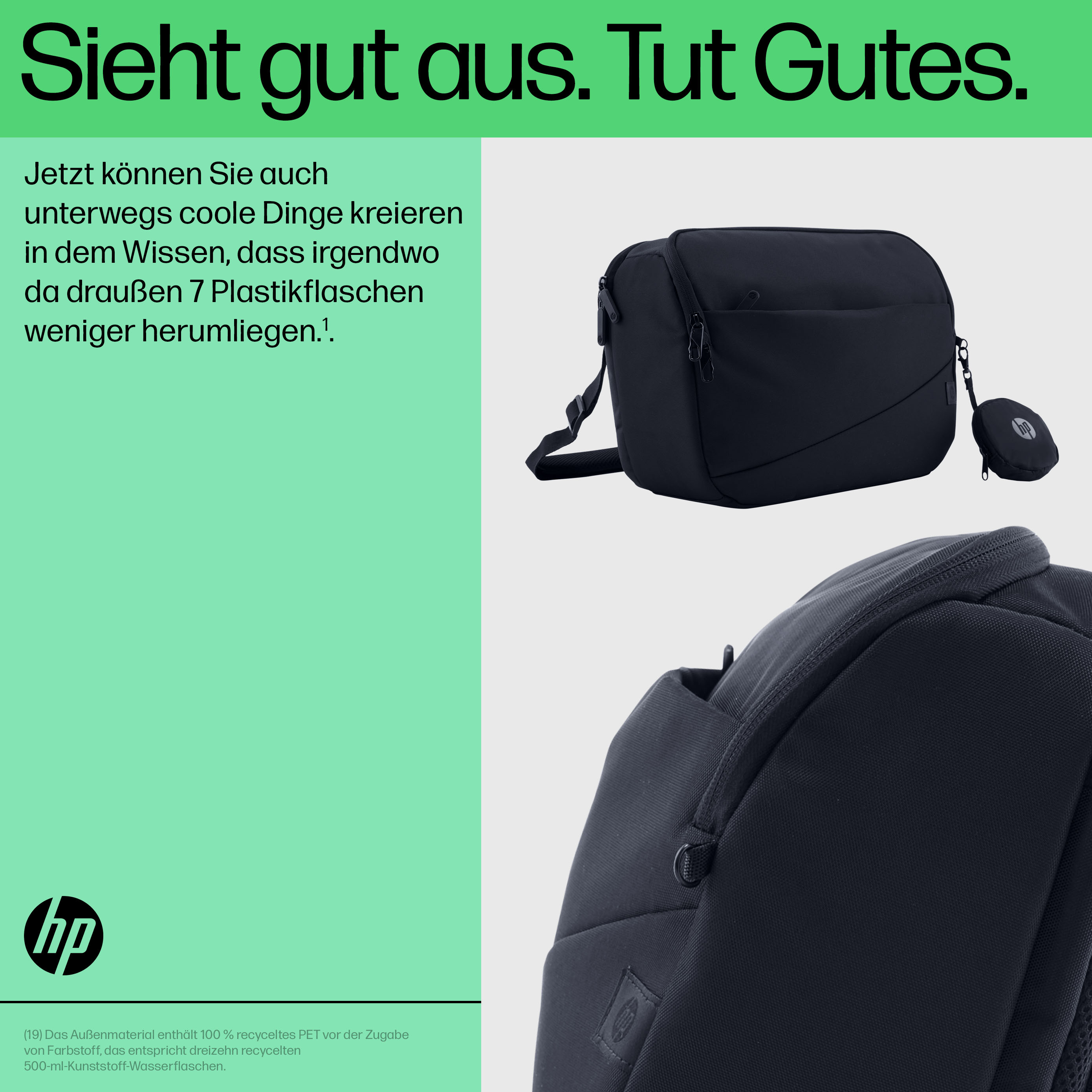 | Nachhaltige Technologien und Materialien: | 100 % recycelter Haushaltskunststoff; Die LDPE-Tasche besteht zu 100 % aus recyceltem Kunststoff; Das Aufhängeretikett besteht zu 100 % aus recyceltem Papier |