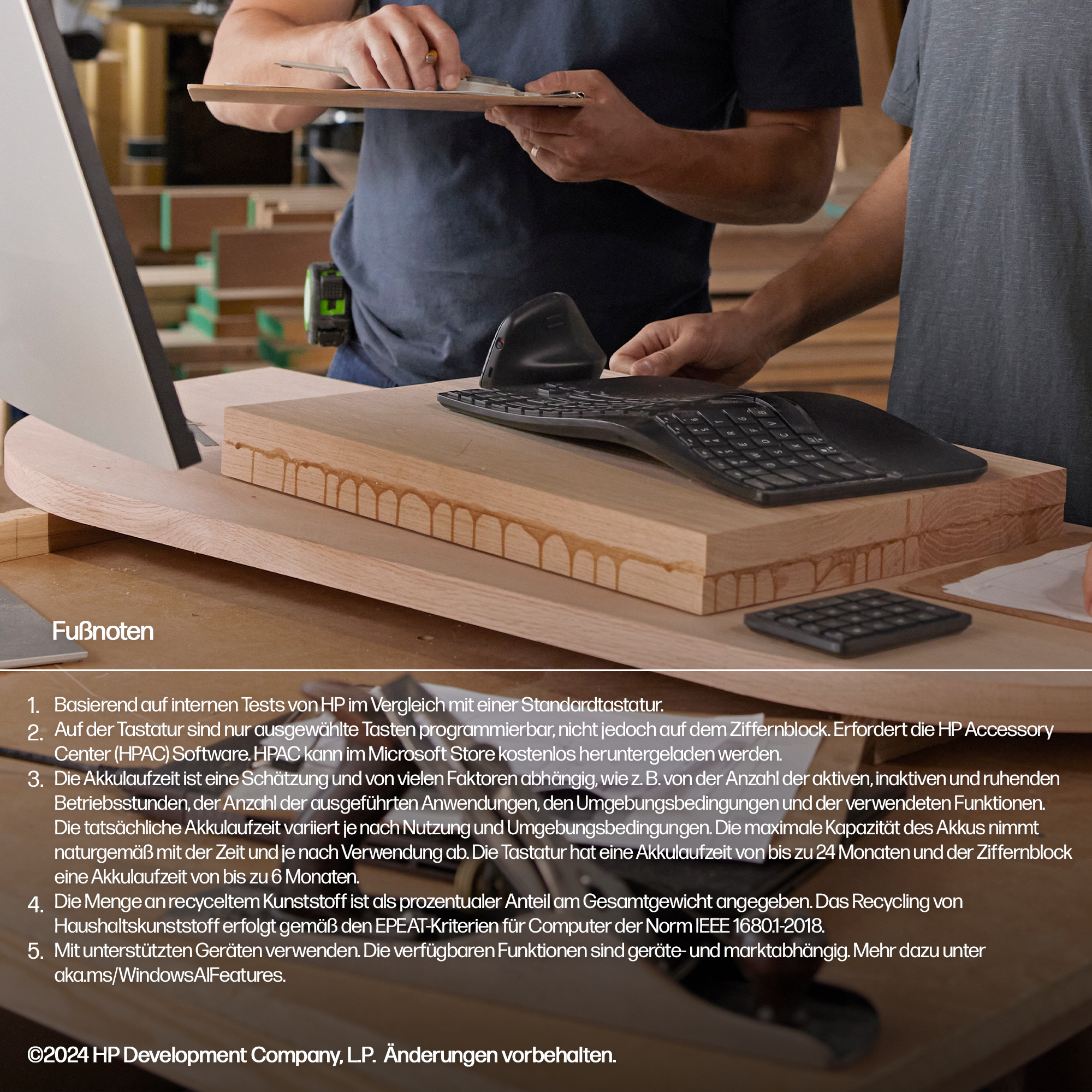 Leben. Arbeit. Gleichgewicht.Bauen Sie Ihren perfekten Arbeitsbereich auf, mit der wissenschaftlich entwickelten ergonomischen Wireless-Tastatur von HP. Das geteilte Design passt sich Ihrer Körperhaltung an, und zwanzig programmierbare Tasten[1] sowie ein separater Ziffernblock bieten optimale individuelle Konfigurationsmöglichkeiten. Und dank zwei Möglichkeiten, Geräte zu verbinden, können Sie sicher sein, stets mit den richtigen Tools zur Bewältigung Ihrer Aufgaben ausgestattet zu sein.