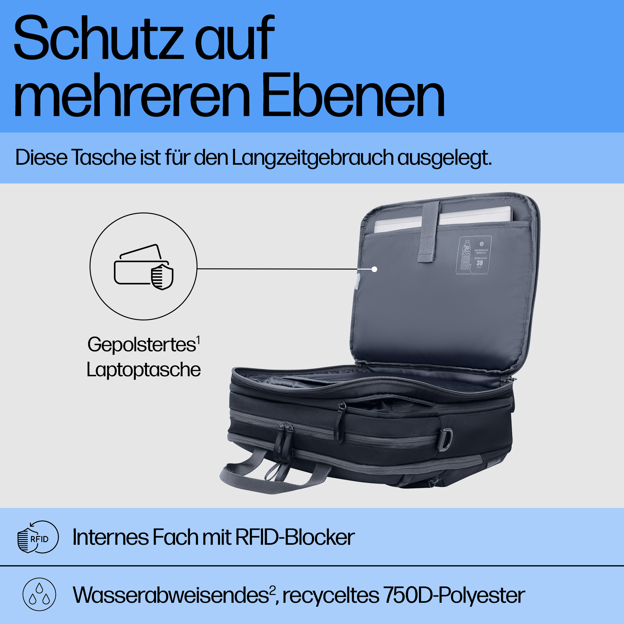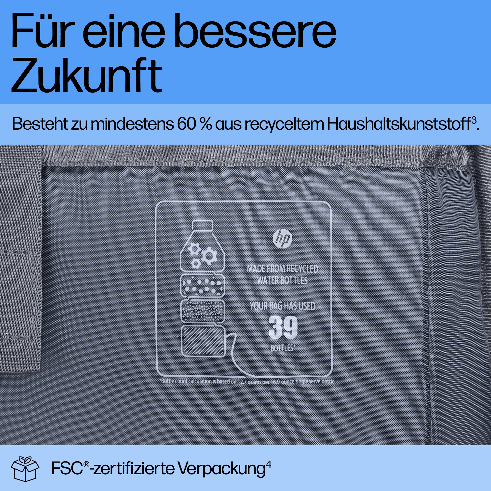 Nachhaltige Technologien und Materialien: FSC-zertifizierte Verpackung; 60 % recycelter Haushaltskunststoff; Die LDPE-Tasche besteht zu 100 % aus recyceltem Kunststoff; Das Anhängeretikett besteht zu 100 % aus recyceltem Papier