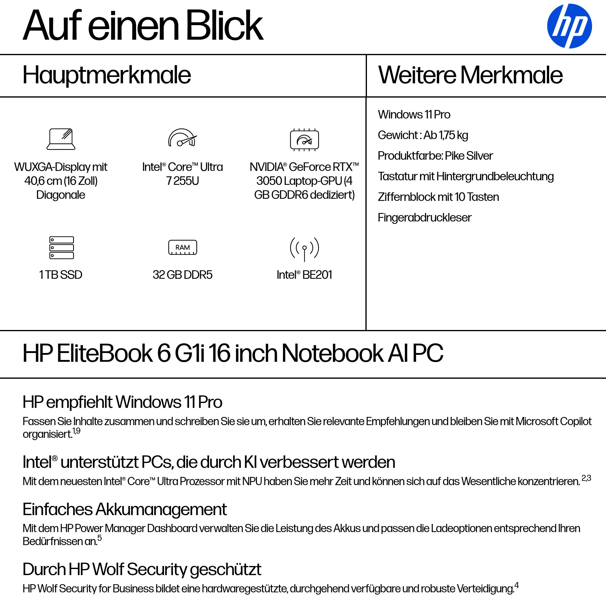KI-basierte Funktionen und moderne Konnektivität steigern die Produktivität der Benutzerinnen und Benutzer. Der HP EliteBook 6 G1i AI 16-Zoll-PC bietet eine 11 TOPS NPU[3], Sicherheit und Verwaltbarkeit der Enterprise-Klasse in einem hochgradig konfigurierbaren PC, der die hohen Anforderungen von Unternehmensanwendern erfüllt.